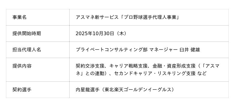当社では、アスリートが競技に集中し、経済的・キャリア的な自立を目指せるよう、IFA業務で培った知見をもとに、アスリート向け金融支援サービス「アスマネ」を展開してきました。 今回、プロ野球選手のより長期的なキャリア形成や資産形成の支援を進められるよう、「アスマネ」のサービスとして、代理人事業を開始しました。