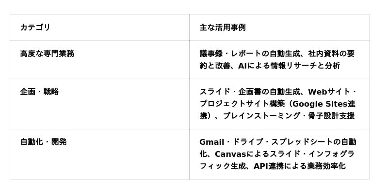 ChatGPTとの違いを理解し、Gmail・ドライブ・ドキュメント・スプレッドシート・スライド・Meet・Canvasといった主要ツールを横断的に活用することで、「情報収集 → 生成 → 共有」までをAIで完結できるワークフローを構築します。