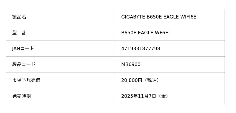 株式会社ニューエックス(本社:東京都千代田区)は、取り扱いメーカーであるGIGABYTEより、AMD B650チップセットを搭載したEAGLEシリーズ ATX マザーボードの「GIGABYTE B650E EAGLE WIFI6E」を2025年11月7日(金)に発売いたします。
