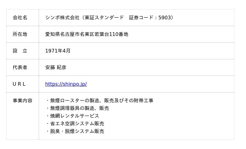 [画像8: https://prcdn.freetls.fastly.net/release_image/116317/3/116317-3-27a093aaac399af27ed38903babb49a0-907x671.jpg?width=536&quality=85%2C75&format=jpeg&auto=webp&fit=bounds&bg-color=fff ]シンポ株式会社は、創業から一貫して「焼く食文化」の発展に努め、これからも更に追求を続ける