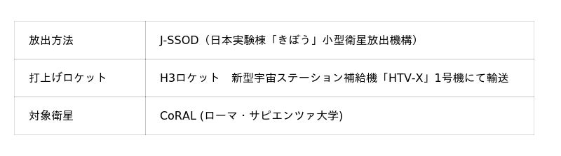 CoRALは、欧州宇宙機関(ESA)のプロジェクトとして、Thales Alenia Space Italia社、ローマ・サピエンツァ大学(CRASおよびS5Lab研究グループ)、TeleSpazio S.p.A.が共同開発した2Uサイズの小型衛星(CubeSat)です。低消費電力通信モジュールを活用した衛星間IoT通信ネットワークの実証および軌道上での電波干渉モニタリングを目的としています。2021年に開発が開始され、今回のHTV-X1ミッションにより打上げが実現しました。