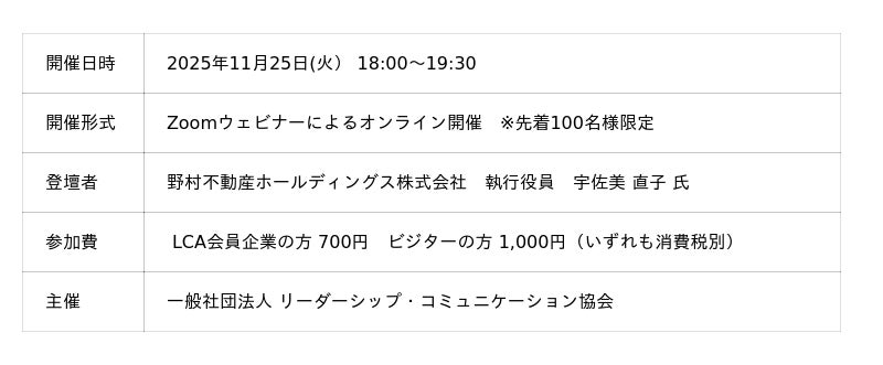 一般社団法人 リーダーシップ・コミュニケーション協会(本部:東京都、代表理事 芳賀日登美、以下LCA)は2025年11月25日(火)に、野村不動産ホールティングス株式会社 執行役員の宇佐美直子氏を講師に迎え、「私のキャリア感~「問いは何か?」を追い求めて~」と題して、「第28回 LCA Women’s Businessセミナー」をオンラインで開催します。