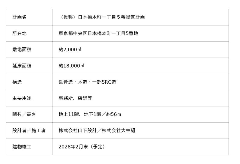 本計画は、三井不動産が持続可能で豊かな環境を広げる街づくりを推進する代表エリア、東京・日本橋に位置しており、COREDO室町1・2・3に近接する江戸桜通り沿いに位置し、「日本橋本町三井ビルディング &forest」に次ぐ当社2棟目のハイブリッド木造賃貸オフィスビルとなります。先進的な木造設計に強みを持つ株式会社山下設計と、純木造建築を含む多様な木造建築物の施工実績を有する株式会社大林組との協働により、2028年2月の竣工を予定しています。