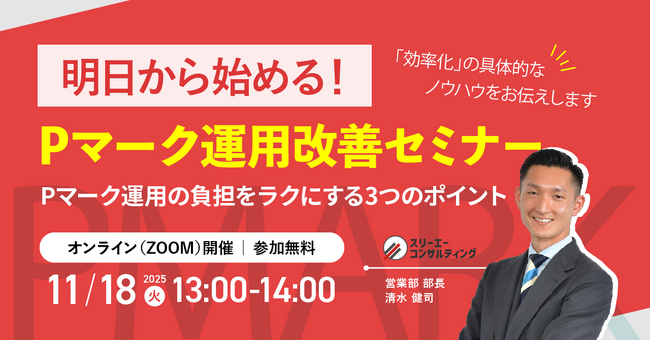 Pマーク、 ISOコンサルにおける支援実績 No.1(注1)のISO/Pマークの取得・運用支援サービス「認証パートナー」を提供する株式会社スリーエーコンサルティング(本社:大阪府大阪市、代表取締役社長:竹嶋 寛人)は、11/18(火)13:00-14:00「明日から始める!Pマーク運用改善セミナー ~ Pマーク運用の負担をラクにする3つのポイント~」を開催します。