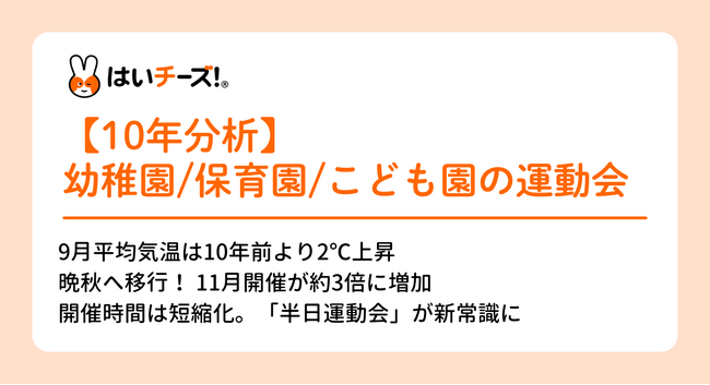 写真と食の力で子どもの幸せを創ることを目指す総合保育テックサービス「はいチーズ!」を提供する千株式会社(本社:東京都千代田区、代表取締役社長 千葉伸明、以下 当社)は、全国の幼稚園・保育園・こども園における過去10年間(2016~2025年)の運動会データを独自に分析しました。