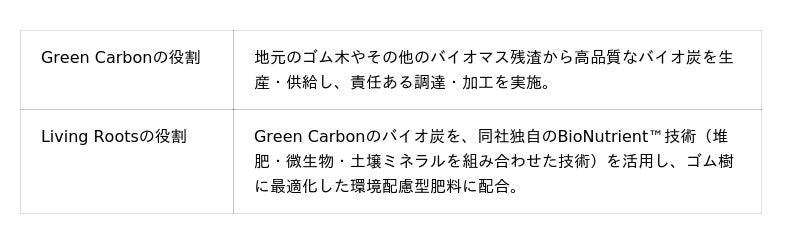 ネイチャーベースのカーボンクレジット創出・販売事業を展開するGreen Carbon株式会社(代表取締役:大北潤、以下Green Carbon(グリーンカーボン))は、再生型農業ソリューションを展開するLiving Roots Pte. Ltd.(本社:シンガポール、CEO:アビ・アガルワル、以下Living Roots)と、タイをはじめとする東南アジアのゴム農園を対象に、バイオ炭由来の有機肥料の共同開発・商業化に関する覚書(MOU)を締結しました。