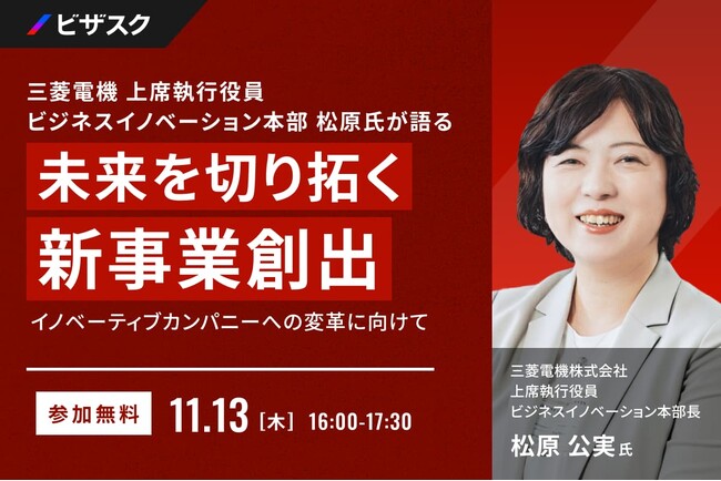 「知見と、挑戦をつなぐ」をミッションにグローバルなナレッジプラットフォームを運営する株式会社ビザスク(以下、当社)は、『未来を切り拓く新事業創出』をテーマに、三菱電機株式会社 上席執行役員 ビジネスイノベーション本部長 松原 公実氏 ご登壇による無料オンラインセミナーを 11/13 (木) 16:00 より開催します。