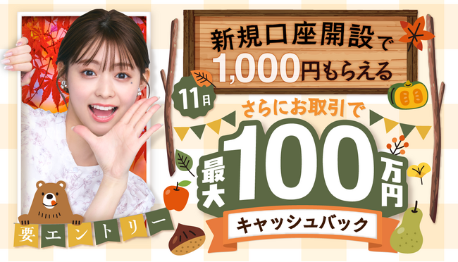 11月に新しく口座開設いただいたお客さまを対象に、2025年12月12日(金)16時00分までにキャンペーンエントリーからお申込みでもれなく1,000円をキャッシュバック、さらに期間中のお取引数量に応じて、最大100万円をキャッシュバックいたします。