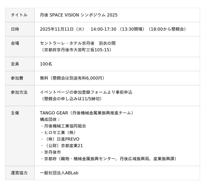 宇宙ビジネスの検討と挑戦をサポートする一般社団法人ABLab(所在地:東京都中央区、代表理事:伊藤真之、以下ABLab)は、京都府のTANGO GEAR(丹後機械金属業振興推進チーム)に協力し、2025年11月11日、京丹後市にて、「丹後 SPACE VISION シンポジウム 2025」を開催します。