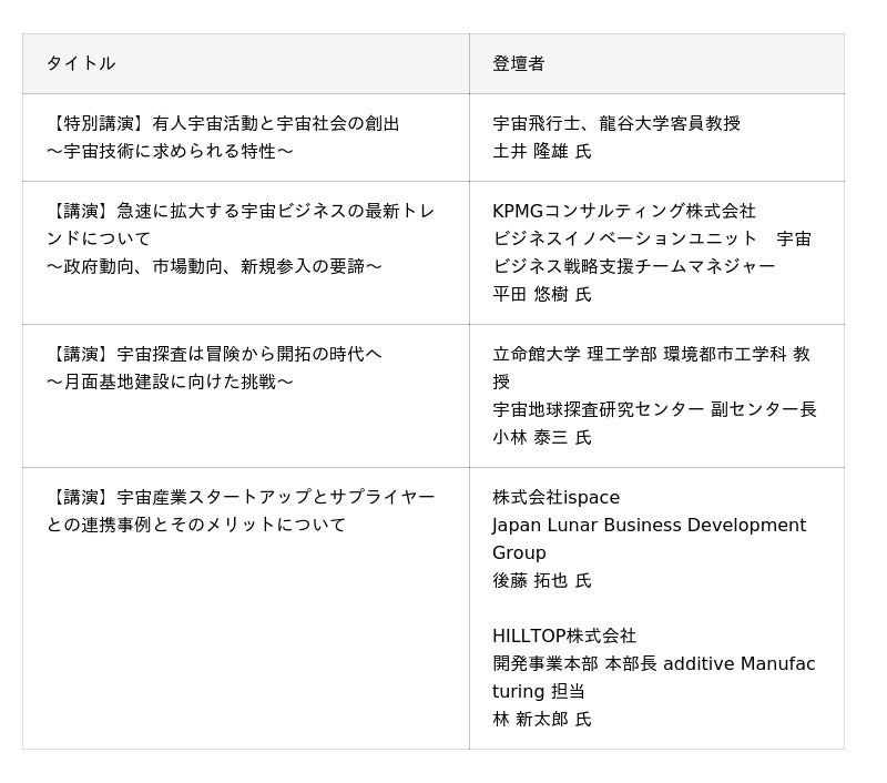 丹後地域で培われた技術と、宇宙開発との架け橋を創出することを狙いとし、土井宇宙飛行士、立命館大学、宇宙ベンチャーによる講演とトークセッションをお届けします。