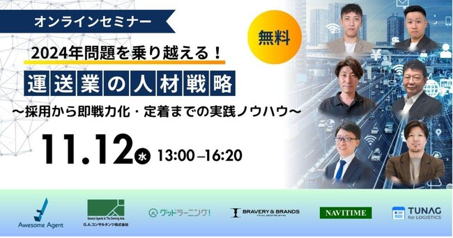 運送事業者向け安全教育システム「グッドラーニング!」を提供する株式会社キャブステーション(本社:東京都新宿区、代表取締役:楠木 崇延)は、2025年11月12日(水)に6社で共催されるオンラインセミナー「2024年問題を乗り越える!運送業の人材戦略~採用から即戦力化・定着までの実践ノウハウ~」に登壇することをお知らせします。