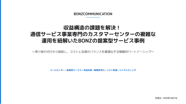 株式会社ボンズコミュニケーション(本社:神奈川県横浜市、代表取締役社長:山本 篤史)は、コールセンター事業を運営するクライアント企業(以下、クライアント)の収益構造に関する課題を解決した提案型BPO事例を公開しました。