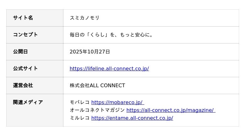 通信インフラ事業と地域振興事業を手掛ける株式会社ALL CONNECT(代表取締役社長:岩井 宏太/本社:福井県福井市)は、電気・ガス・水・通信などの生活インフラに関する情報を発信する新メディア『スミカノモリ』を公開しました。