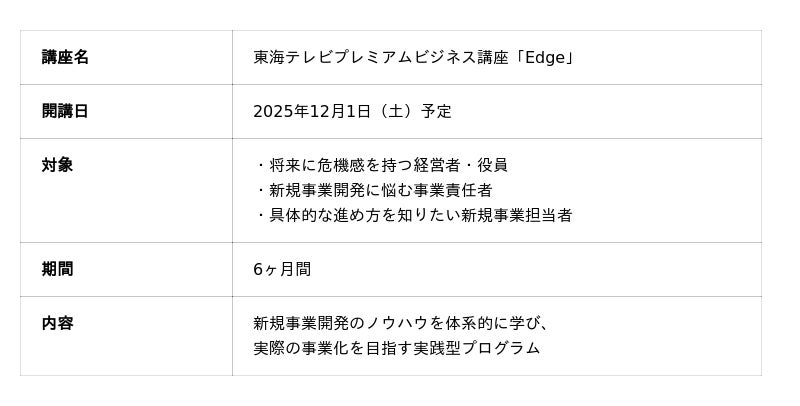 東海テレビと共に、新規事業を「学び」「生み出し」「育て」「広げる」ことに挑むプレミアムビジネス講座「Edge」。
