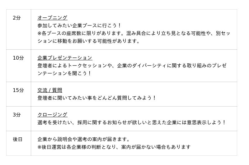 17:40 - 19:10の時間で、1セッション30分で企業担当者と交流ができます