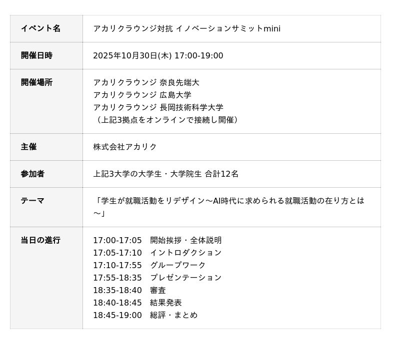 博士人材をはじめとする大学院生・研究者のキャリア支援を行う株式会社アカリク(本社:東京都渋谷区、代表取締役:山田 諒、以下 アカリク)は、2025年10月30日(木)、アカリクが運営する地方学生のキャリア支援拠点「アカリクラウンジ」の3拠点(奈良先端科学技術大学院大学、広島大学、長岡技術科学大学)をオンラインで結び、初の各拠点対抗アイデアソン「アカリクラウンジ対抗 イノベーションサミットmini」を開催しました。