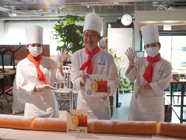 株式会社モンシェールのパティシエさんのお手伝いのもと、鈴木のりたけさんが巻いた超ロング「堂島ロール」が完成!