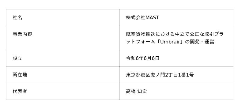 株式会社商船三井(代表取締役社長:橋本 剛、本社:東京都港区、以下「当社」)の新規事業提案制度(註1)により創立された、株式会社MAST(代表取締役社長:高橋 知宏、本社:東京都港区、以下「MAST」)が、航空輸送におけるスポット貨物取引(註2)の市場で業界初(※)となる、中立で公正な共通取引プラットフォーム「Umbrair(アンブレア)」の提供を開始しました。MASTは航空貨物取引のDXを推進することを目的とし、2022年度から事業化に向けた検証を積み重ねてきました。今回提供開始するUmbrairは、複雑で専門性の高い荷主とフォワーダー(註3)の受発注業務を初動から成約まで一貫してオンライン上で完結し、業界内で取引される航空貨物取引業務の高度化を推進する公平なサービスです。