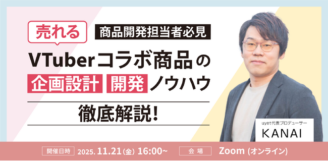VTuber、IPコンテンツを通して日本と世界で新たな流通を生み出す“IPコンテンツの総合商社”株式会社uyet(ユエット)(本社:東京都渋谷区、代表取締役:梶田大樹)は、11月27日(木)19時より、VTuberの活用を検討している企業様向けのウェビナー「【企業担当者必見】売れるVTuber”コラボ商品“の企画設計、開発ノウハウを徹底解説!」を開催します。