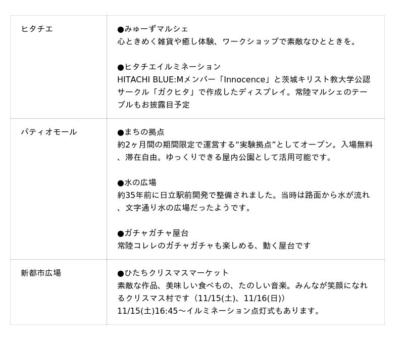 その第2回社会実験として、2025年11月15日(土)に「HITACHI BLUE:M STREET PARK(ヒタチブルーム ストリートパーク)」を開催。当日、パティオモールの空き店舗や公共空間を活かした“みんなでつくる実験の場”となるまちの拠点もオープンします。