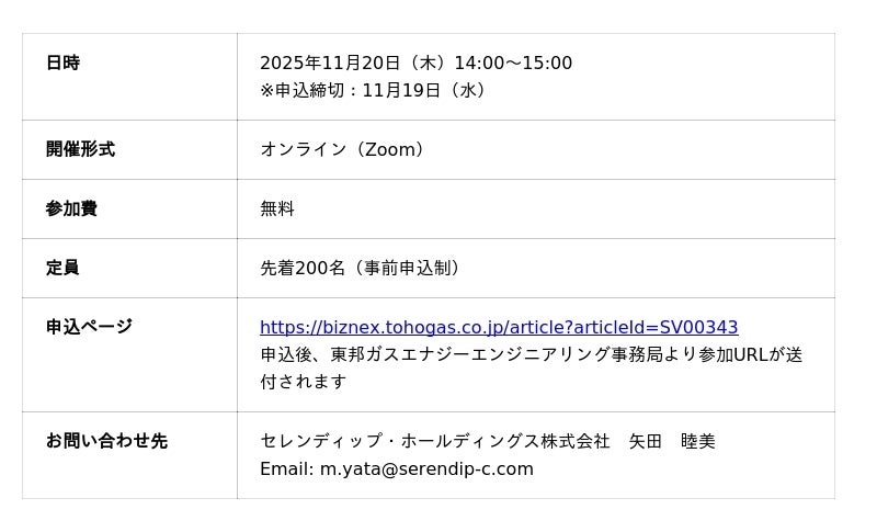 セレンディップ・ホールディングス株式会社(本社:愛知県名古屋市、代表取締役社長兼CEO:竹内 在)のグループ企業である三井屋工業株式会社(本社:愛知県豊田市、代表取締役社長:高橋 直輝 以下、三井屋工業)は、2025年11月20日(木)に開催される東邦ガスエナジーエンジニアリング株式会社(本社:愛知県名古屋市、取締役社長:玉田 勝也 以下、東邦ガスエナジーエンジニアリング)主催の「脱炭素と収益化を両立!製造現場のカーボンニュートラル実践」Webセミナーに登壇いたします。