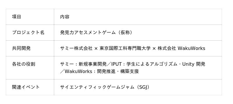 本プロジェクトでは、サミーの新規事業開発における構想力、IPUT の教育実践力、WakuWorks の開発推進・実装支援の知見を掛け合わせ、協働体制を構築。