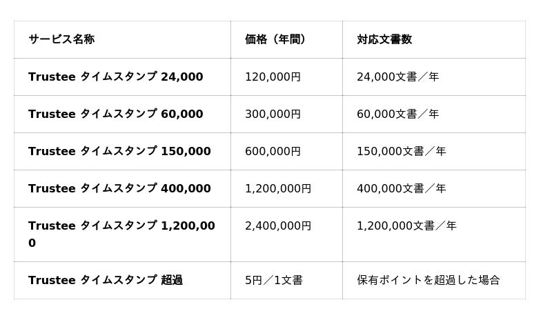 「Trustee タイムスタンプ」のご利用はポイント制となり、サービス提供価格は以下です。