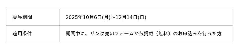 ・当該フォーム以外から無料掲載に関するご相談をいただいた場合は、本キャンペーンの対象外となります。