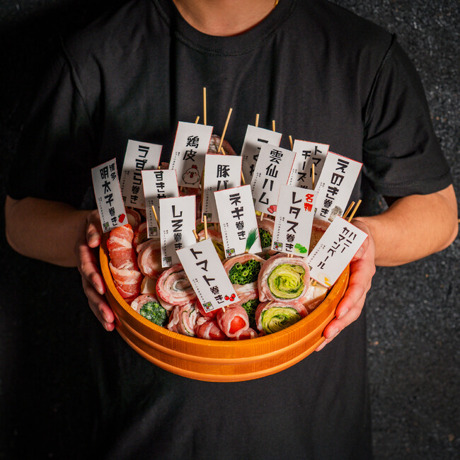◆新鮮なお野菜を上質な国産豚肉で巻いて味わう"野菜巻き串"ヘルシーなのに加えてボリューム満点。ジューシーな肉の旨味とヘルシーな野菜を同時に味わうことができる魅惑の串メニュー。素材を高める火入れ技でじっくりと炭火で焼き上げた至高の旨味が実現。