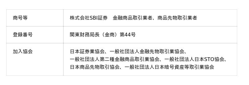 SBI証券で取り扱っている商品等へのご投資には、商品毎に所定の手数料や必要経費等をご負担いただく場合があります。また、各商品等は価格の変動等により損失が生じるおそれがあります(信用取引、先物・オプション取引、商品先物取引、外国為替保証金取引、取引所CFD(くりっく株365)、店頭CFD取引(SBI CFD)では差し入れた保証金・証拠金(元本)を上回る損失が生じるおそれがあります)。各商品等への投資に際してご負担いただく手数料等及びリスクは商品毎に異なりますので、詳細につきましては、SBI証券WEBサイトの当該商品等のページ、金融商品取引法等に係る表示又は契約締結前交付書面等をご確認ください。