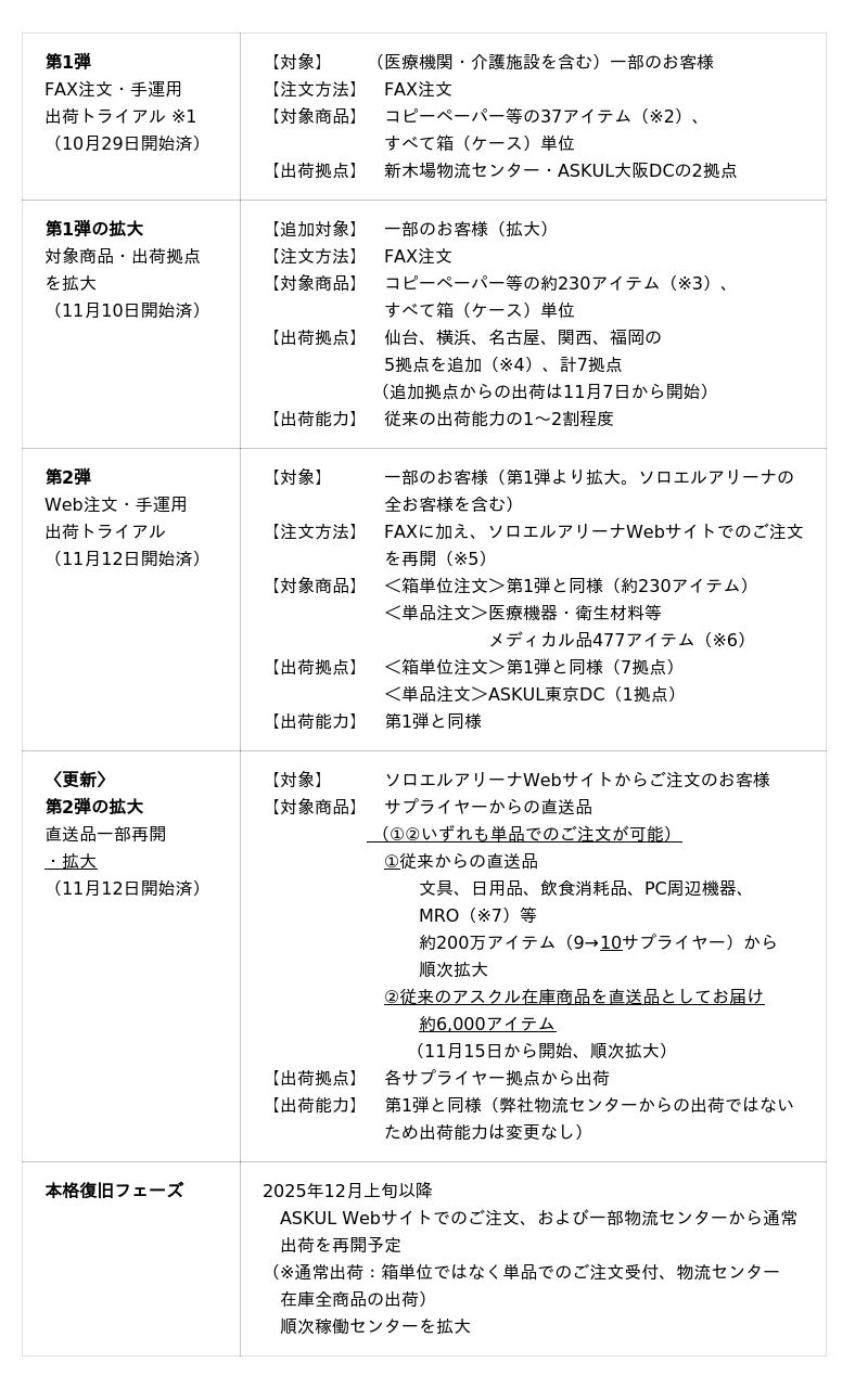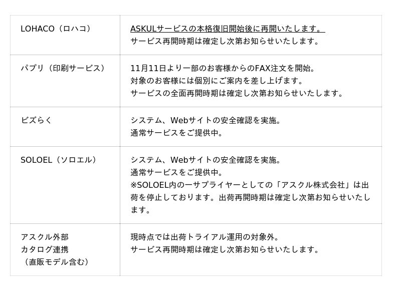 弊社サービスの復旧は、事業所のお客様の業務継続を最優先ととらえ、ASKUL(事業所向け)サービスを先行して対応を進めております。サービスのWebサイトは、セキュリティ対策の強化を実施し安全性を確認したうえで再開、出荷は安定稼働を確認しながら順次拡大してまいります。