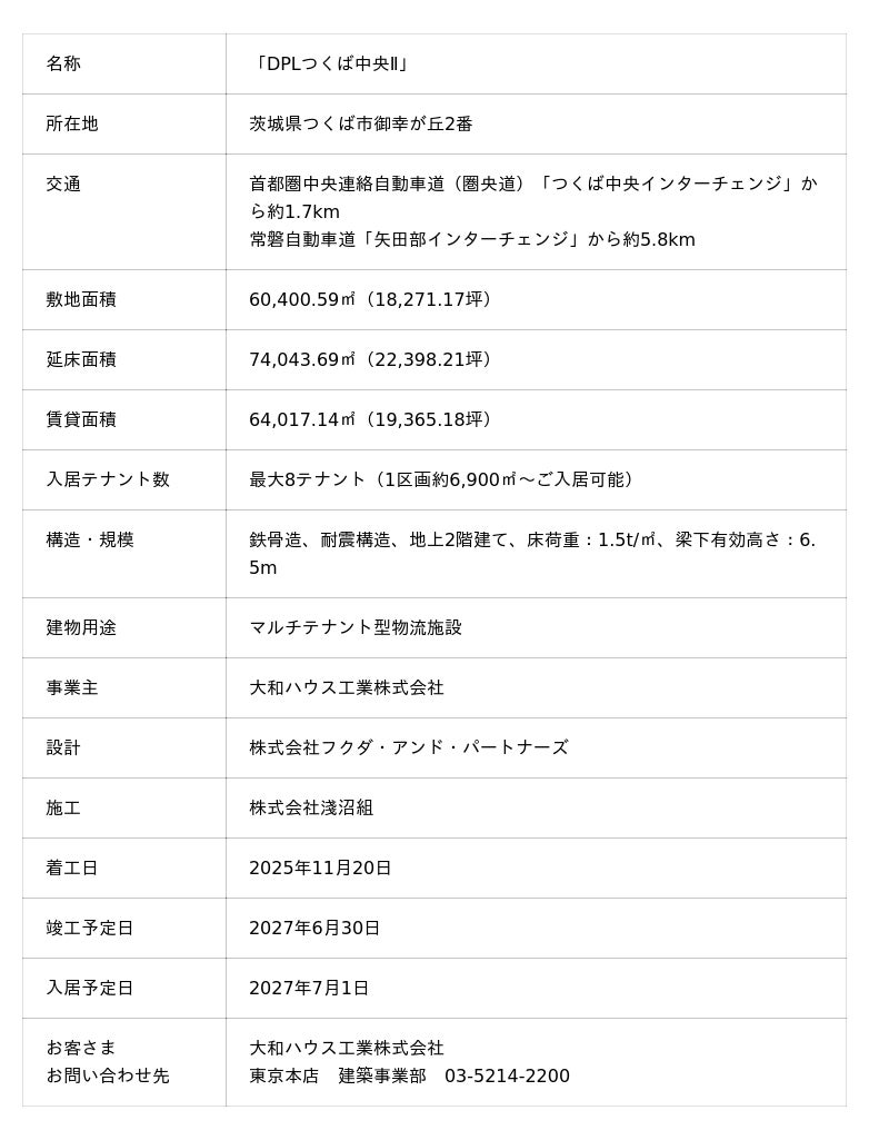 大和ハウス工業株式会社は、茨城県つくば市において、コールドチェーン(低温物流)に対応可能なマルチテナント型物流施設(※1)「DPLつくば中央II」(地上2階建て、敷地面積:60,400.59平方メートル 、延床面積:74,043.69平方メートル )を2025年11月20日に着工します。