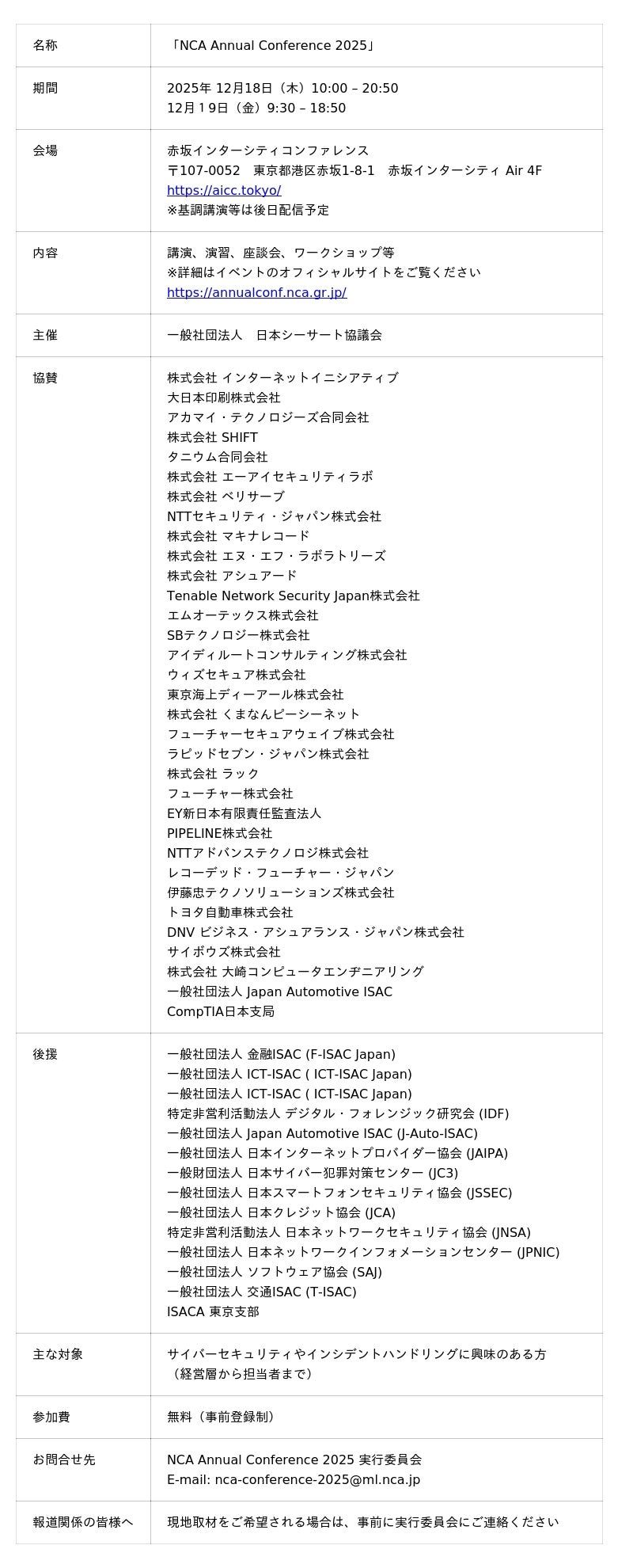一般社団法人 日本シーサート協議会(以下、NCA)は12月18日(木)~19日(金)に
