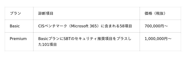 ・Premiumプラン:Basicプランの診断に加え、監査ログやMicrosoft Defender製品の詳細設定、DLP(情報漏えい対策)や情報保護など、より高度で多層的なセキュリティ設定を診断します。