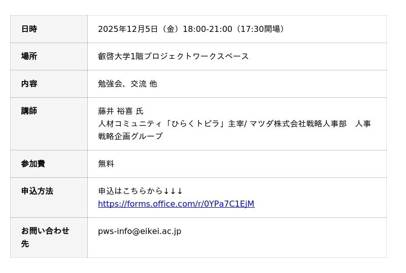 叡啓大学(学長:有信睦弘、広島市中区)は、12月5日(金)、「【PWSイベント】キャリア自律について~ 学び続ける環境をいかに作るか~」を叡啓大学のプロジェクトワークスペースで開催します。
