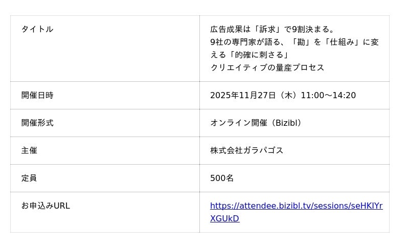 【2025年11月27日(木)】ガラパゴス主催カンファレンス開催:広告成果は「訴求」で9割決まる。9社の専門家が語る、「勘」を「仕組み」に変える「的確に刺さる」クリエイティブの量産プロセス