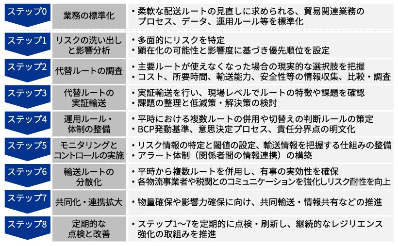 KPMGコンサルティングでは、こうした国際輸送が抱える不確実性への対応力を高めるため、貿易関連業務の標準化を起点に、リスクの洗い出しと影響分析から、代替ルートの実証輸送、輸送ルート分散化、継続的な改善までを網羅した8つのステップで段階的に取組みを支援します。これにより、企業は平時から複数ルートを併用することで、有事にも対応可能なBCP(事業継続計画)体制を整備でき、国際輸送のレジリエンスを継続的に高めることが可能となります。
