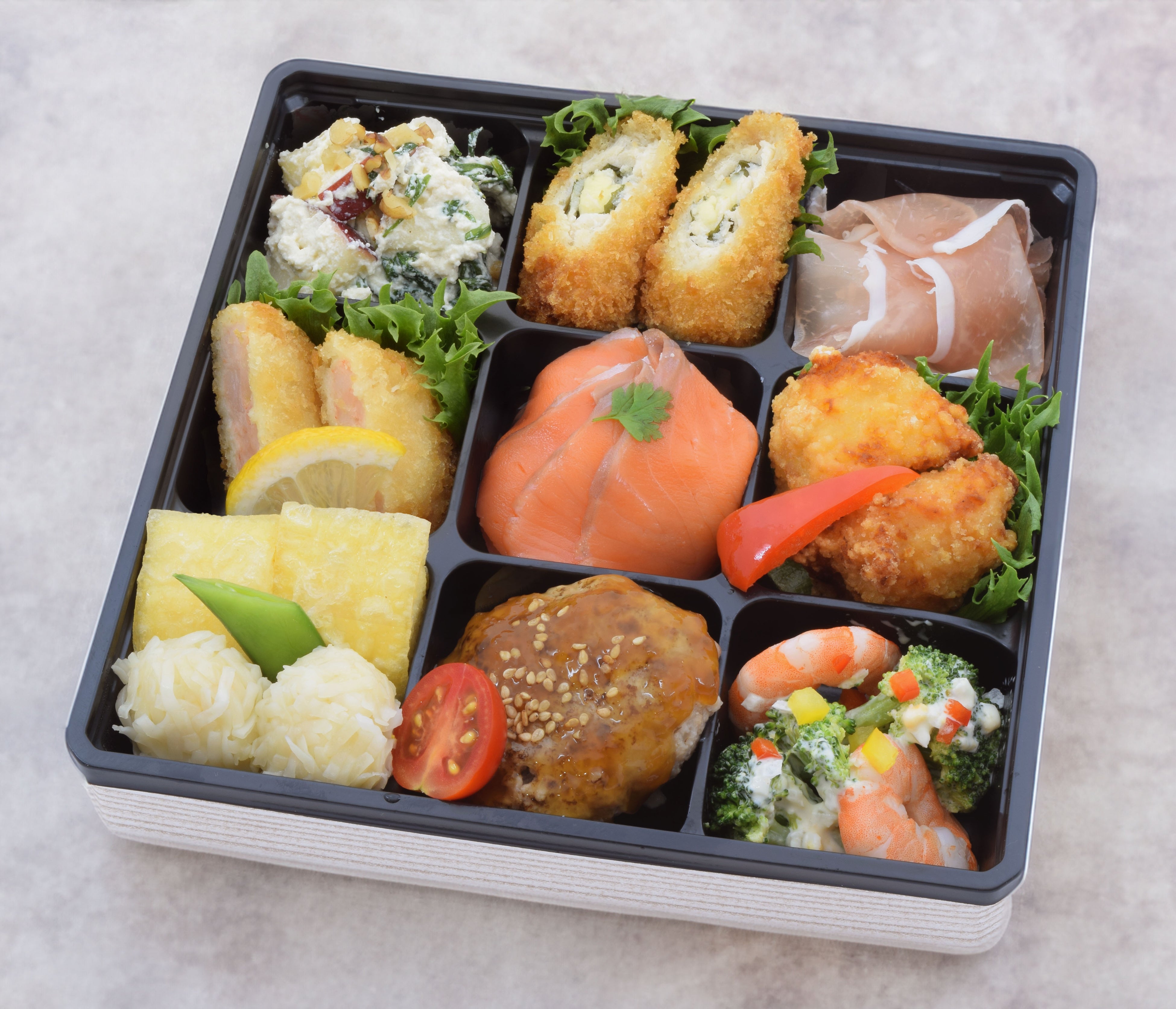 梅の花人気の『湯葉揚げ&豆腐しゅうまい』をはじめ『チキンチーズ大葉フライ』や『海老カツ』『豆腐ハンバーグ』『生ハム』『りんごと春菊とくるみの白和え』『スモークサーモンと角切りポテトサラダ』『長州鶏の湯葉唐揚げ』『海老とブロッコリーの豆乳タルタルサラダ』の9つの仕切りに人気の惣菜を詰め込んだクリスマスオードブルです。
