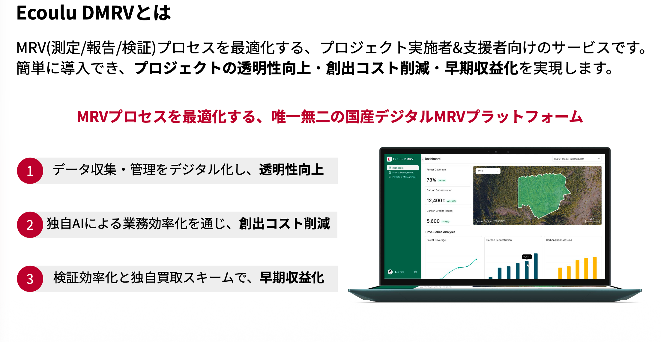 脱炭素プロジェクト向けに、MRV(測定・報告・検証)プロセスを効率化する国産デジタルMRVプラットフォーム「Ecoulu DMRV」 を開発・提供。