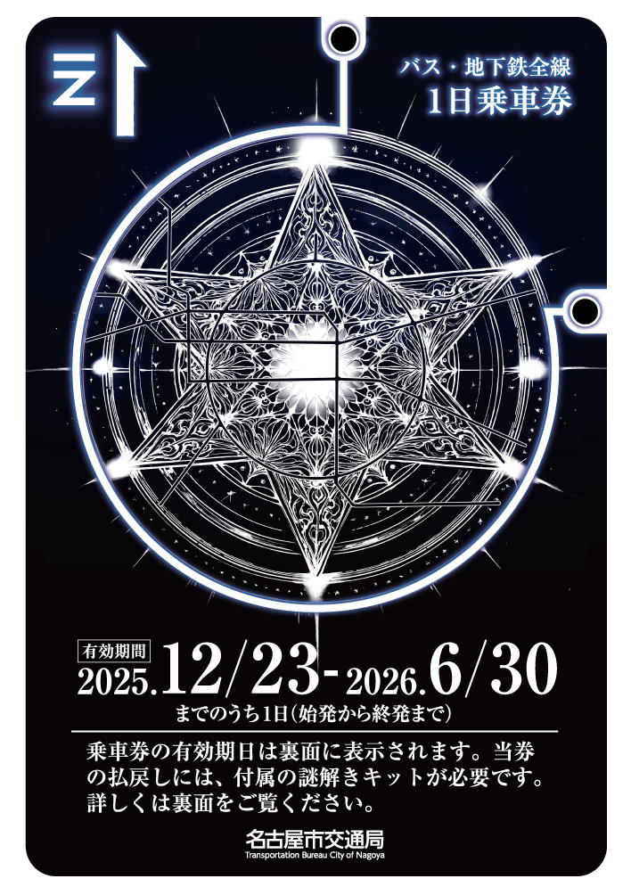謎解きイベントに参加するのに必要な、謎解きキット、専用一日乗車券も今回のストーリーに合わせたデザインに!名古屋市内に出現する魔法陣を捜索しに行こう!