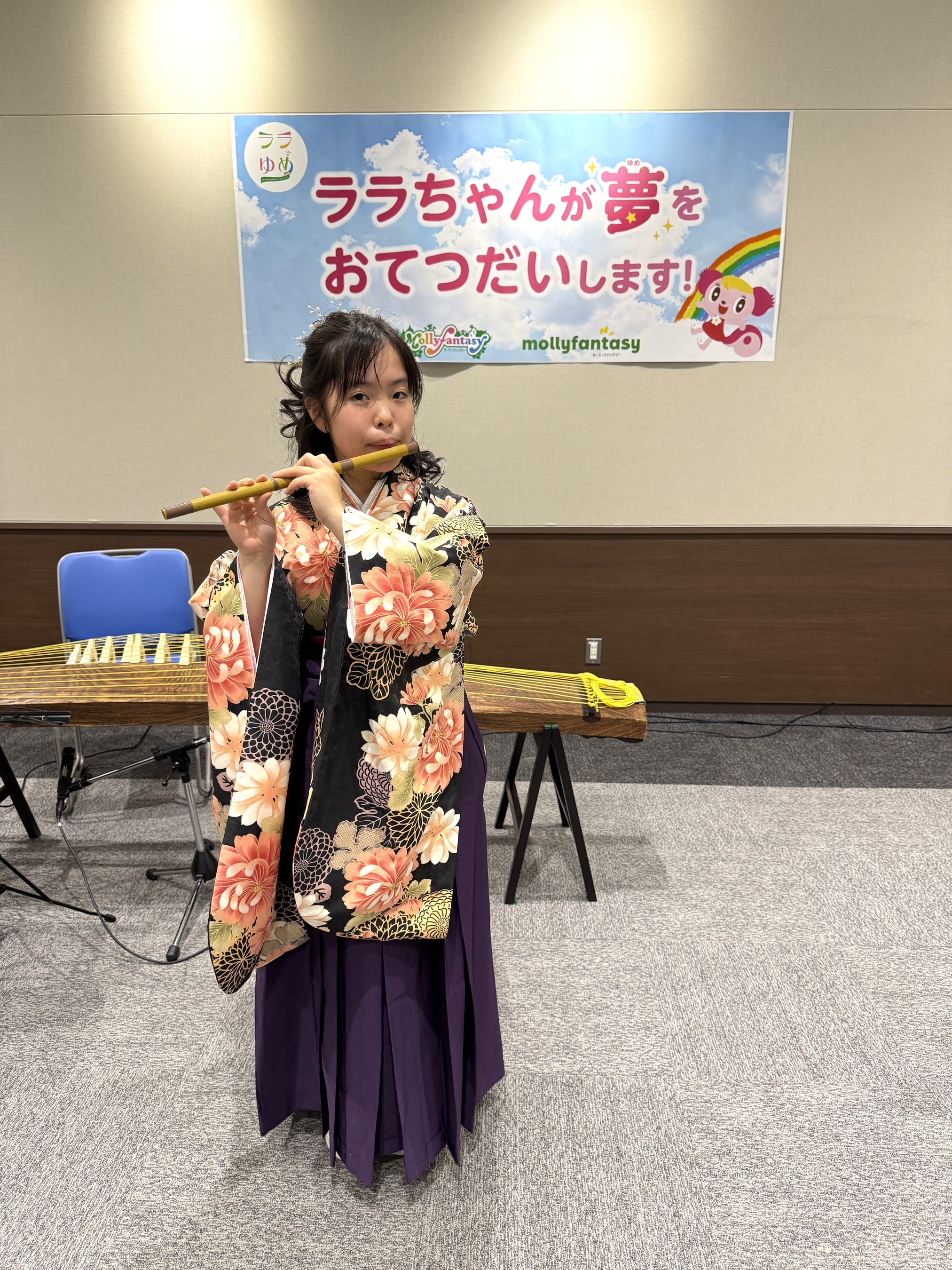 今年の「ララゆめ」に、全国から1,048件の夢の応募があり、その中から選ばれた一人がみことさんです。「和楽器の生産や奏者が減っている現状を知り、その魅力を多くの人に伝えたい」という想いから演奏会を開きたいと夢を応募してくれました。小学校の授業で和楽器の魅力に惹かれて以来、父親からプレゼントされた篠笛の練習に独学で励んできましたが、今回は夢の実現に向けて、プロの奏者から本格的な指導を受けて本番に臨みました。<当日の様子>