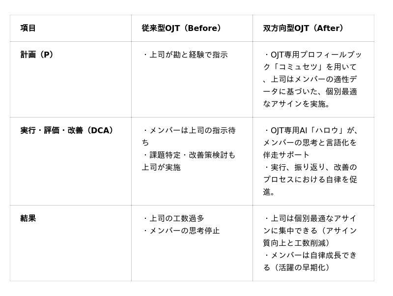 「コミュセツ by OfferBox」は、適性検査と対話AIを活用することで、OJTの構造を「上司→メンバーへの一方通行型」から「上司⇆メンバーの双方向型」へと変革します。