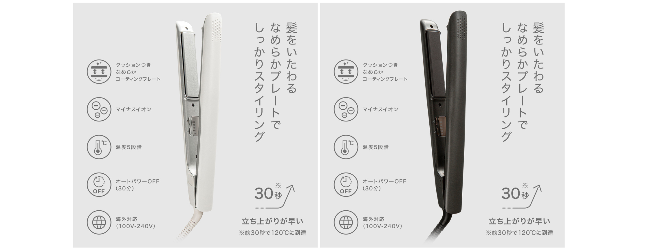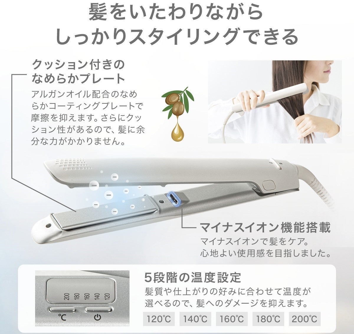 アルガンオイル配合のセラミック塗装を施した「なめらかプレート」を搭載。さらにマイナスイオン機能も搭載しており、髪をいたわりながらスタイリングが可能です。