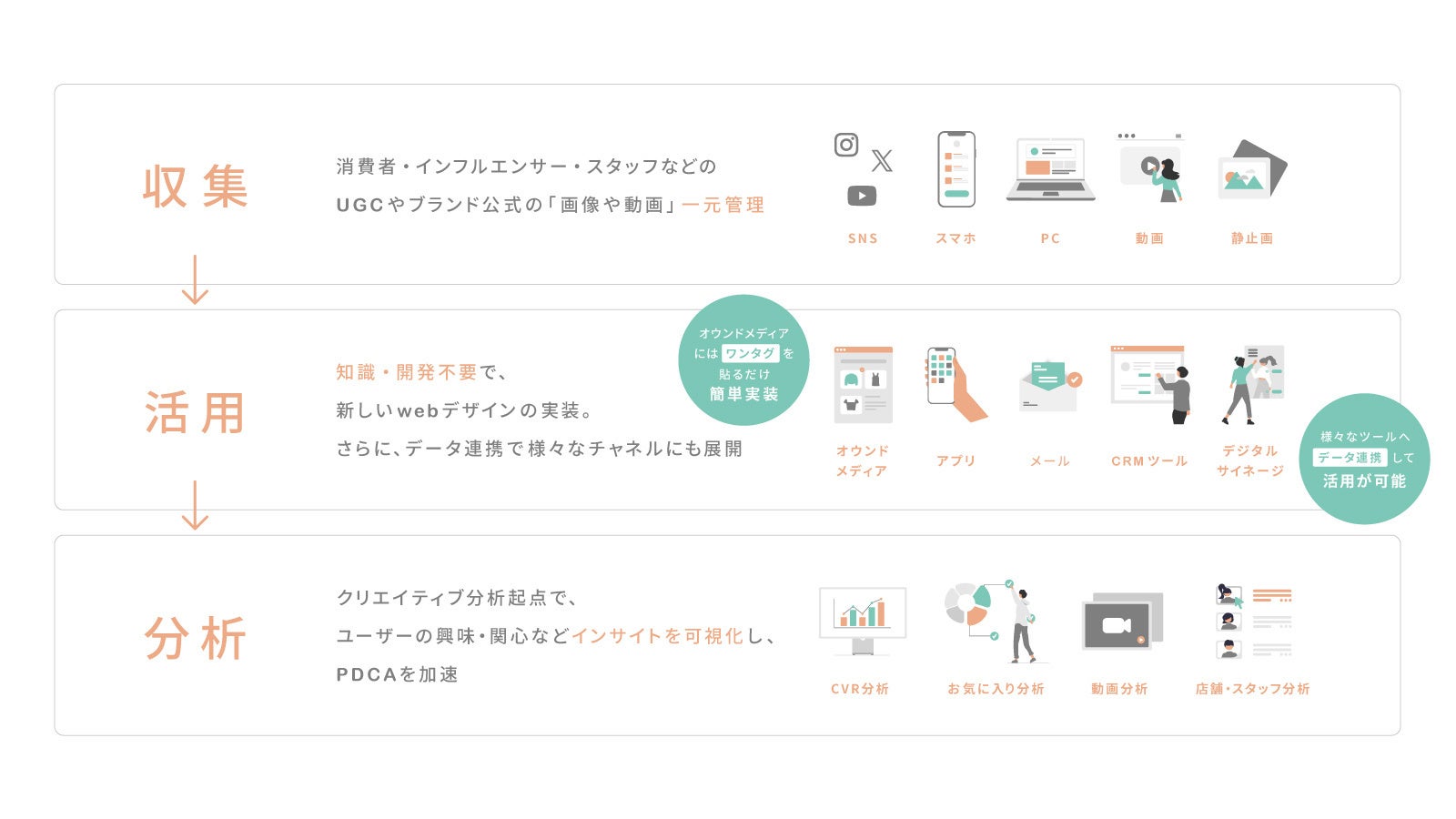 SNS上のUGC、スタッフ投稿、動画、レビューなど多様なクリエイティブ資産を収集・一元管理し、ECサイトやブランドサイトにノーコードで簡単に活用できます。