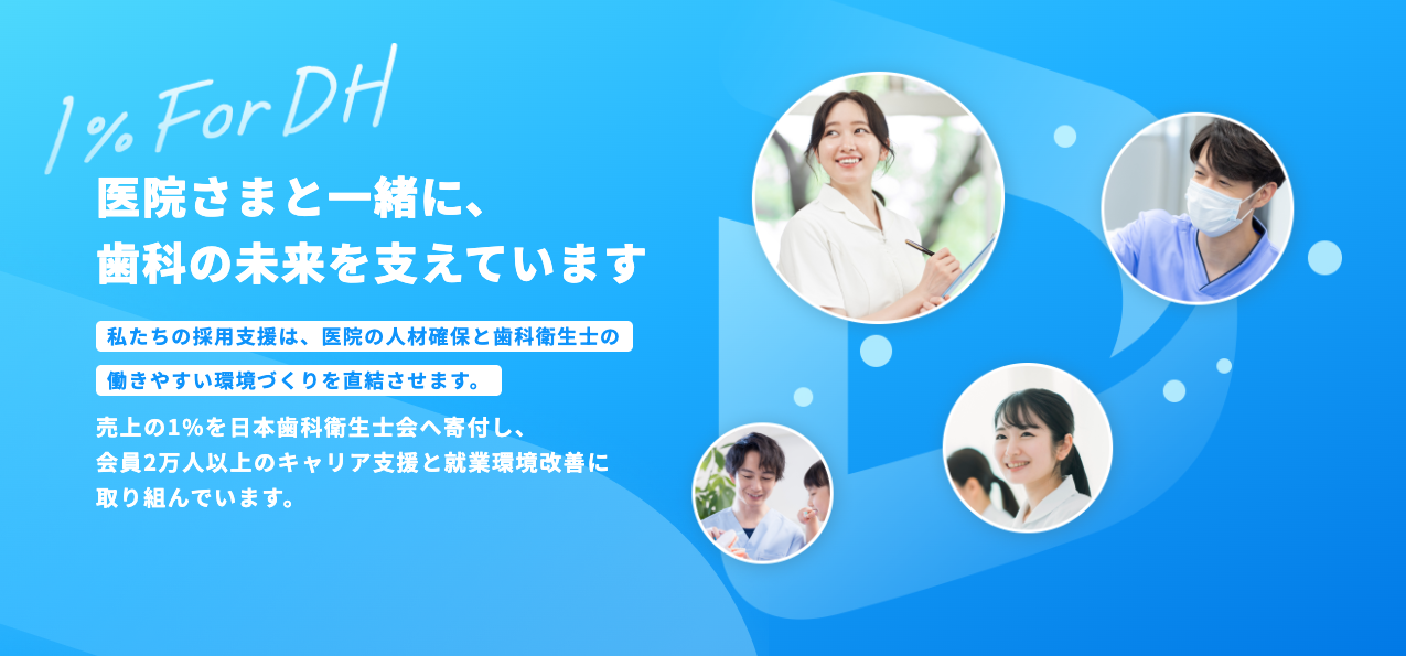 歯科医院専門の採用支援サービスを展開する株式会社デンタルHR総研(本社:東京都、代表取締役:土屋 雅臣)は、は、持続可能な歯科医療の実現を目指し、当社の採用代行サービスの売上高の1%を公益社団法人 日本歯科衛生士会へ寄付するプロジェクト「1% for DH(ワンパーセント・フォー・ディーエイチ)」を開始いたしました。