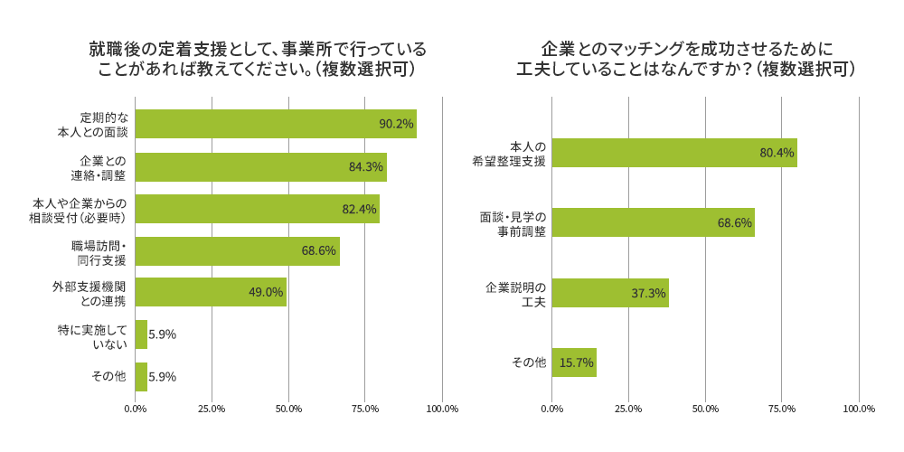 この結果は、障害のある方は「就職後の定着」に課題を抱えている一方で、企業側の意識は「入口」に集中しているという視点の違いと、その定着課題の解決には外部との連携を求めているという、企業側の複合的な状況を示しています。