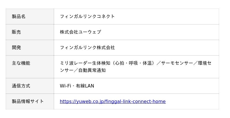 株式会社ユーウェブ(本社:福岡県北九州市、代表取締役:阿部 教子)は、フィンガルリンク株式会社(本社:東京都台東区、代表取締役:名郷根 正昭)が開発した在宅向けミリ波レーダー見守りシステム「フィンガルリンクコネクト」を、2025年12月6日(土)より一部家電量販店で先行販売を開始いたします。