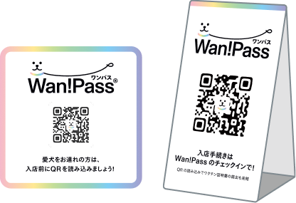 Wan!Passアプリを事前にダウンロードして登録した上で、左図のステッカーにあるQRコードをWan!Passで読み取ります。これにより、入店の際のルールが表示されるため、確認のうえ、入店が可能になります。