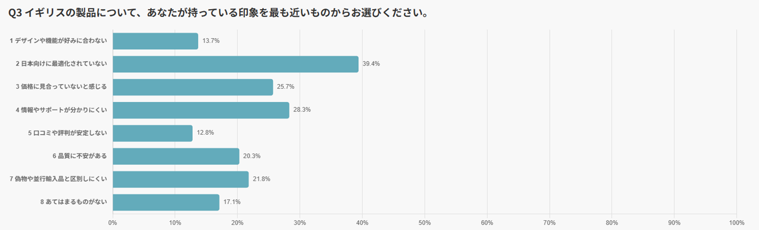 イギリス製品で最も多かった印象は「日本向けに最適化されていない」で39.4%でした。
