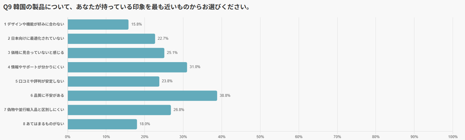 韓国製品で最も多かったのは「品質に不安がある」で38.8%でした。